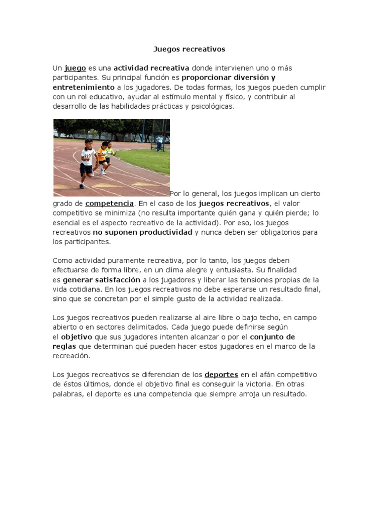 Este juego es adecuado para cualquier edad pero como se hace necesario un poco de ingenio, es recomendable para adolescentes y adultos. Los juegos recreativos son dinámicas o actividades para eliminar el tiempo ocio de una persona, y tiene un efecto muy optimo en la calidad de vida en el documento encontraras juegos recreativos que son aplicados para educación física, mayormente estos juegos son para niños y adolescentes. ¡compra con seguridad en ebay! Los juegos recreativos constituyen aquellas actividades físicas que se desarrollan entre dos o más personas. El juego recreativo se caracteriza por una práctica abierta y lúdica que tiene unas características fundamentales: